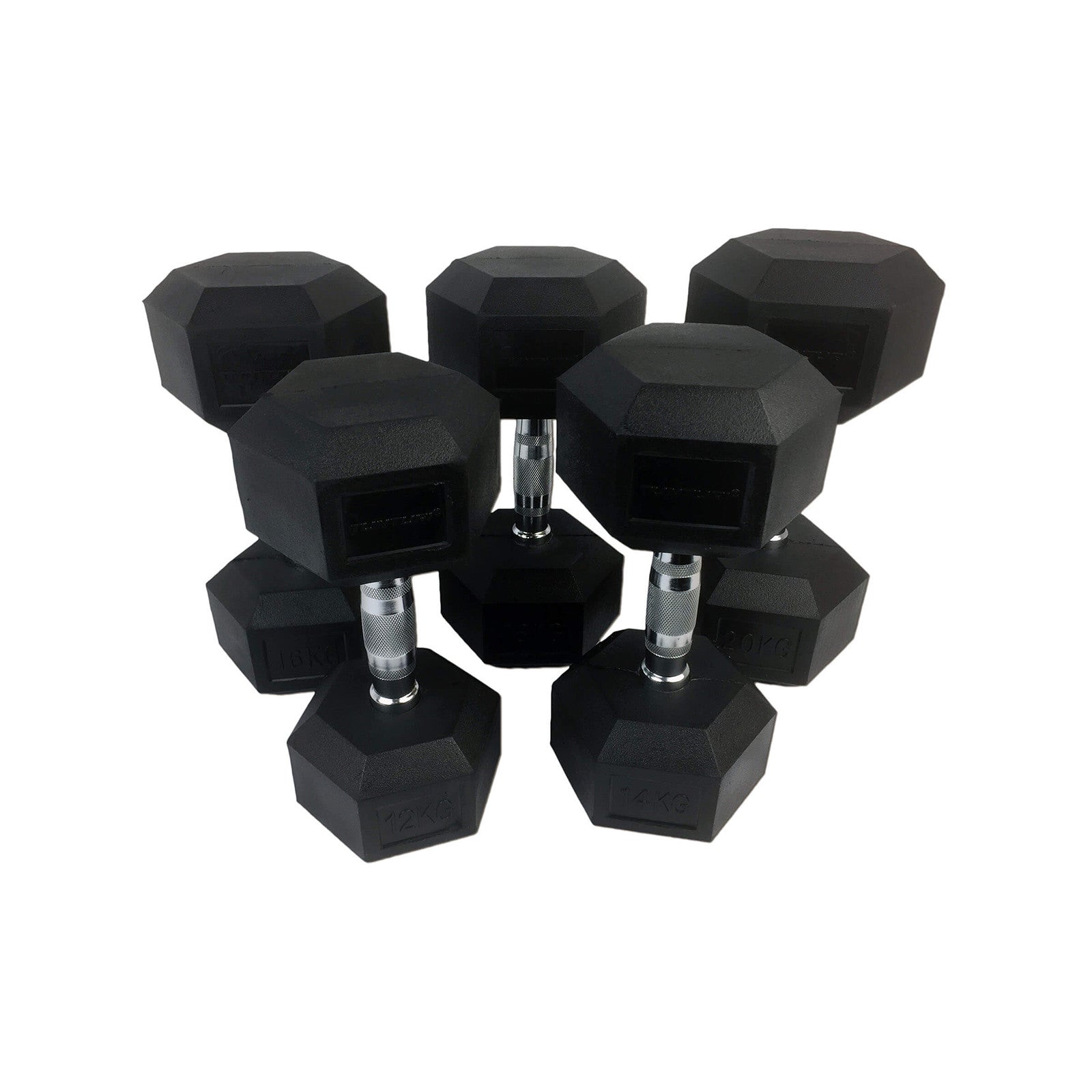 ○ Sarja 10 kuusikantaista käsipainoa: 2 x 12 kg. 10 x 6 x 5 x 6 kuuta | 2 x 14 kg. | 2 x 16 kg. | 2 x 18 kg. | 2 x 20 kg.