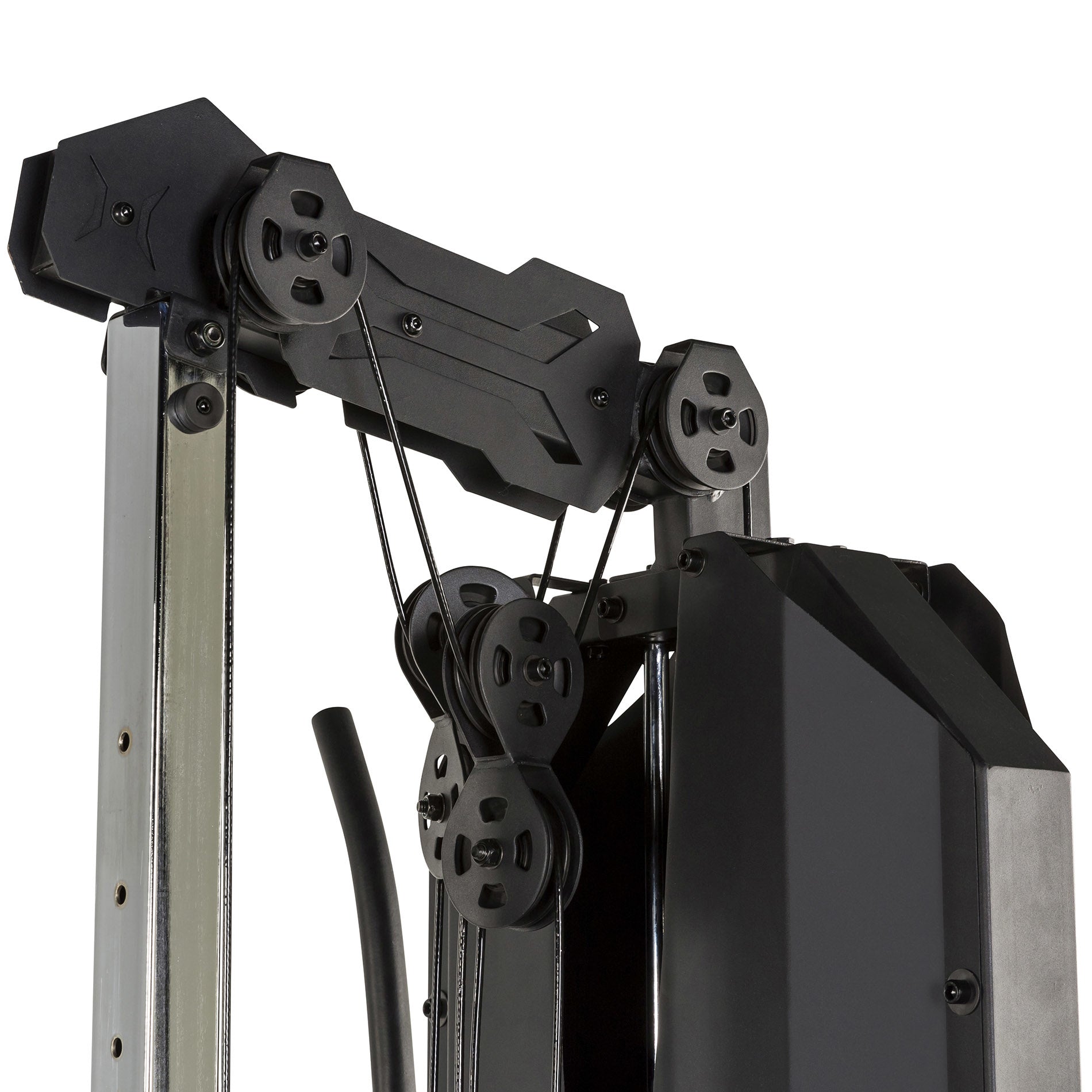 Kuntosalissa on myös kaksi korkeaa ja kaksi matalaa hihnapyörää, joihin voit kiinnittää harjoitusvälineet. Esimerkiksi reaktiotangot, tricepsiköysi tai lat-tanko. Korkeat hihnapyörät ovat korkeussäädettävissä lisäharjoittelumahdollisuuksia varten. Kotijumppaan kuuluu suora lat-vetotanko, kaareva lyhyt tanko, kahvat ja nilkkahihna.