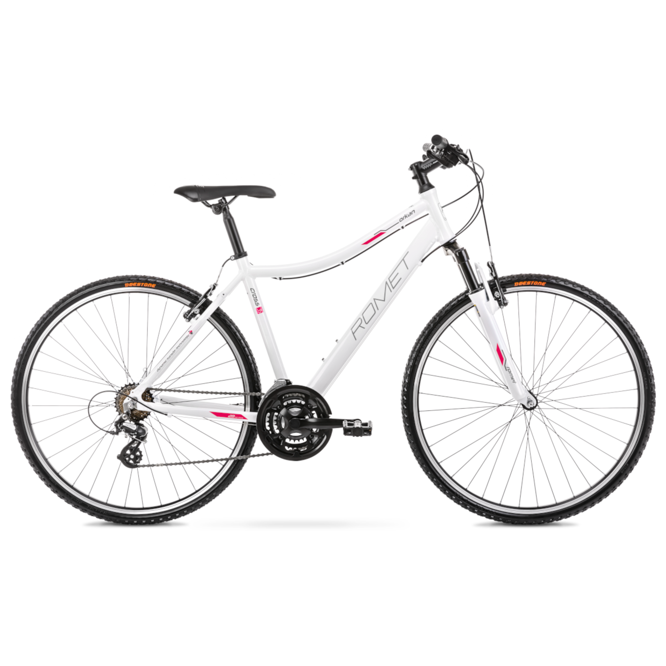 Romet Orkan D -naishybridipyörä soveltuu niin lyhyisiin arkiajeluihin kuin pidemmillekin retkille. 63 mm:n haarukalla, matalammalla rungolla, 28" pyörillä ja 42 mm:n renkailla varustettu pyörä on mukava ajettava.