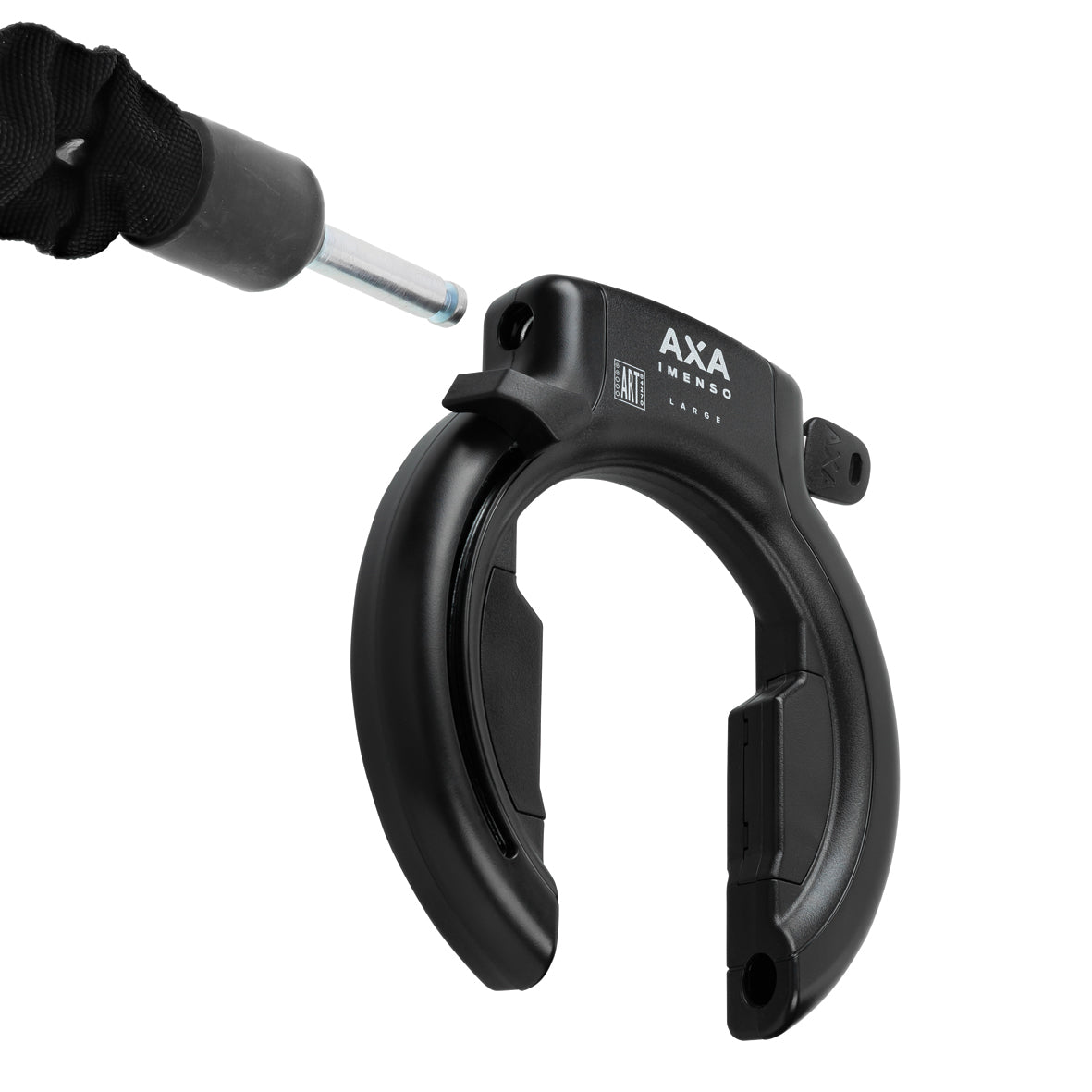 Turvallinen runkolukko AXA Imenso Large. Kiinnittyy takavarteen. Mahdollisuus kiinnittää ketju/köysi lukkoon pyörän lukitsemiseksi paikallaan olevaan kohteeseen. Imenso Large -lukko on leveämpi (75 mm) - sopii pyöriin, joissa on leveämmät lokasuojat ja renkaat.
