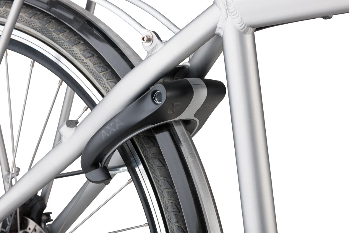 AXA Victory Secure -runkolukko. Kiinnittyy takavarteen. Mahdollisuus kiinnittää ketju/köysi lukkoon pyörän lukitsemiseksi paikallaan olevaan kohteeseen.