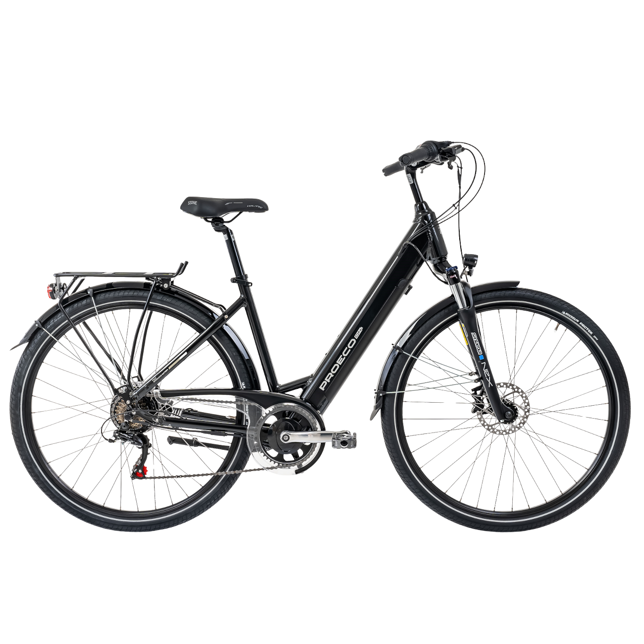 Alumiinikehyksille on ominaista niiden keveys ja lujuus. Kaikki kaapelit kulkevat kehyksen sisällä, mikä takaa, että ne ovat suojassa säältä ja säilyttävät samalla esteettisen ulkonäön. ProEco Wave 1.0 LTD on varustettu SR Suntour -iskulla, jossa on 63 mm:n iskunvaimennus, mikä takaa tasaisen ajon. Sähköpyörä on varustettu 250 W:n Bafang-takamoottorilla, jossa on 32 Nm:n vääntömomentti - kompakti moottori, joka tarjoaa tasaisen ja hiljaisen toiminnan. ProEco-pyörässä on 7 vaihdetta, ja sitä voi vaihtaa Shimano Revoshift -vaihteenvaihtimella. Virtaa antaa 504 Wh:n akku, jonka avulla voit ajaa suhteellisen pitkiä matkoja. Akku on piilotettu rungon sisään, joten sitä ei näe ensi silmäyksellä. ProEcossa on myös hydrauliset levyjarrut, jotka takaavat turvallisuuden jokapäiväisessä käytössä.