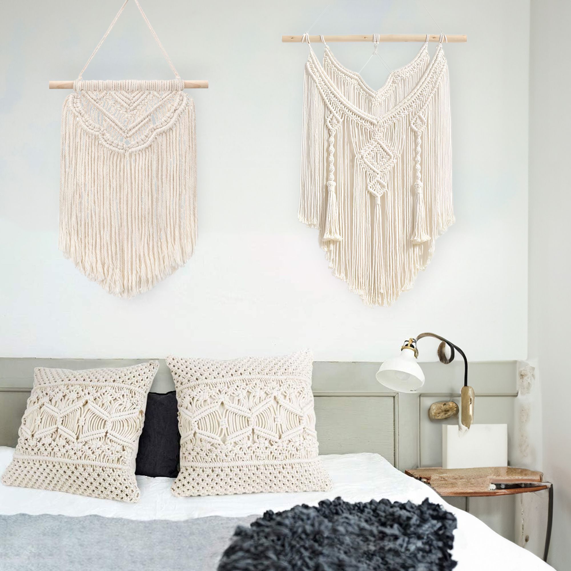 SISUSTUSSETTI SEINÄKORISTE KAKSI BOHO MACRAME + ECRU TYYNY